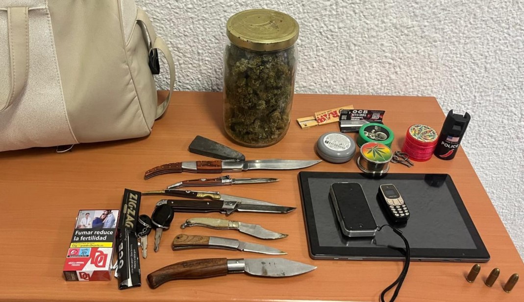 Una vez abierto el automóvil, los agentes detectaron un fuerte olor a marihuana que procedía de un bolso. Alertados por ello, los policías decidieron examinar minuciosamente el vehículo, donde hallaron 110 gramos de lo que, en principio, parece ser marihuana, así como varias armas blancas, un spray de gas pimienta y otros objetos susceptibles que podrían estar ligados a actividades ilícitas.