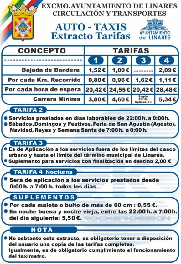 hasta el término municipal de Linares, los precios son 1,62 euros por kilómetro recorrido, 20,42 por hora de espera y suplemento por finalización de destino de dos euros.