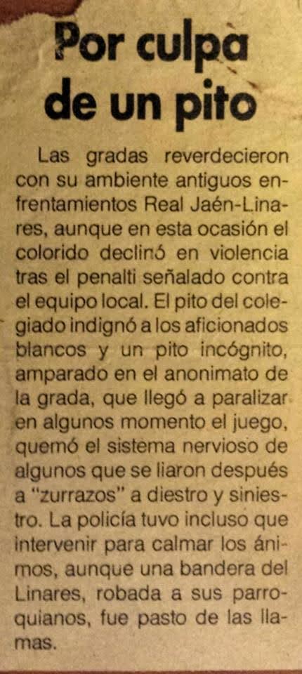 Sin embargo, hay un clásico marcado a fuego en la memoria de los aficionados más veteranos del Linares. Se disputó el 26 de abril de 1987 y correspondía a la jornada 35 del Grupo IX de Tercera División. El antiguo Estadio de La Victoria colgó el cartel de ‘no hay billetes’ para presenciar un derbi de alta voltaje.
