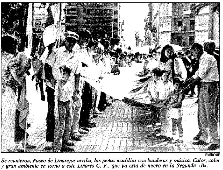 Sin embargo, ese derbi marcó una de las explosiones de linarensismo que más se recuerdan en la ciudad. La junta directiva, presidida por Visiedo, encargó una bandera con los colores azul y blanco tan larga que cubría prácticamente todo el Paseo de Linarejos. Fue portada por escolares de la localidad que la llevaron en volandas hasta el Municipal de Linarejos cantando el himno del club.