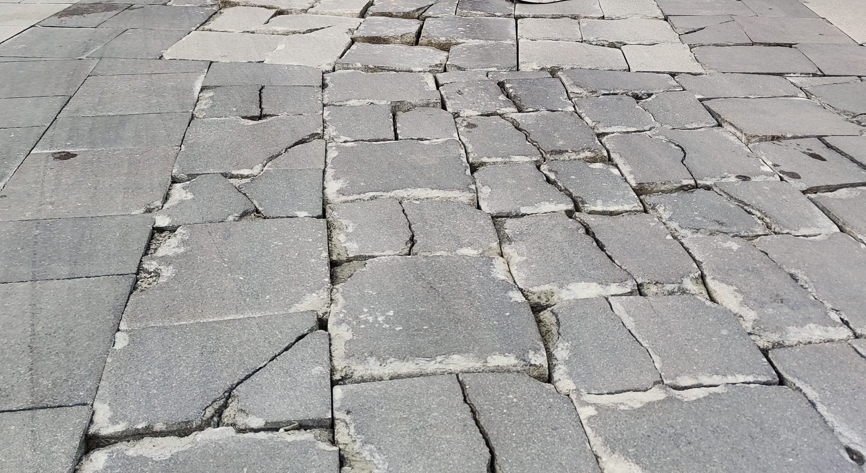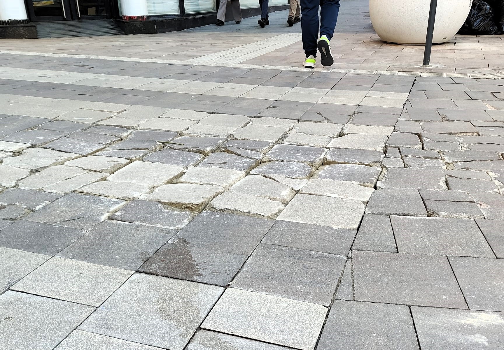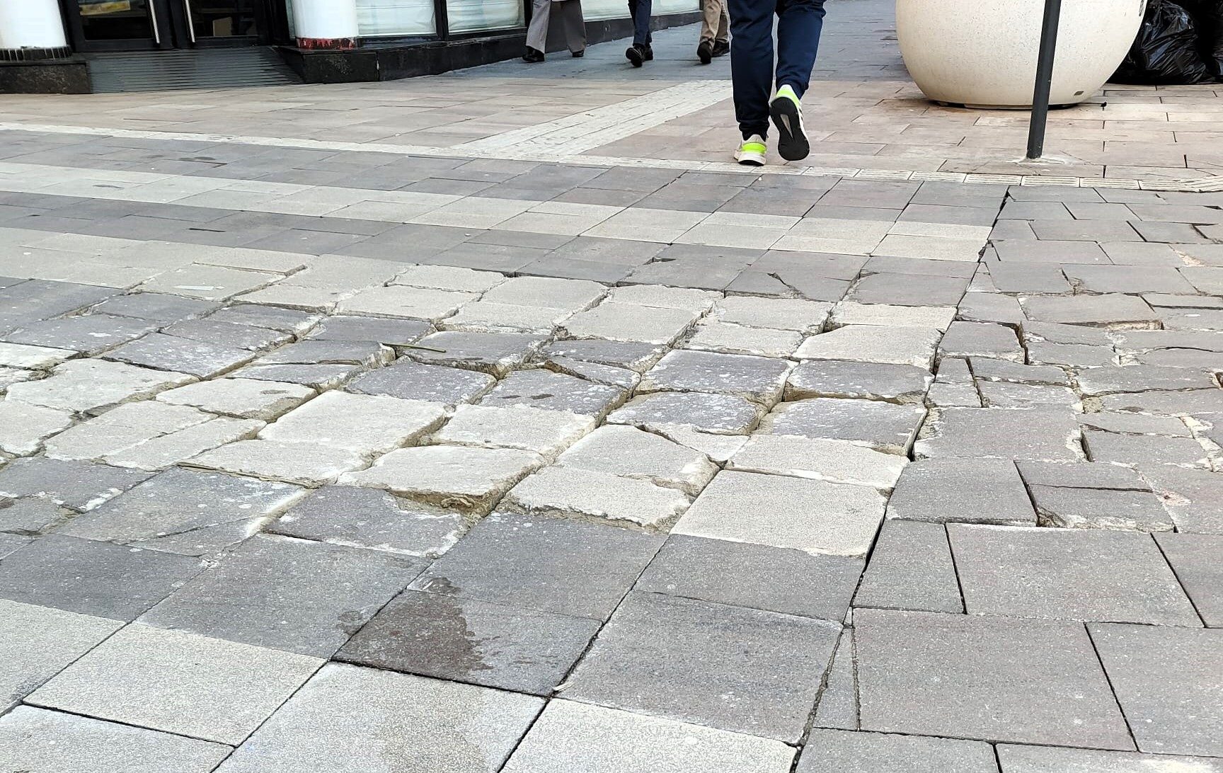 La renovación urbanística de este punto tan importante de la vida de Linares para la creación de la Zona de Bajas Emisiones (ZBE) lejos de solucionar la situación, la ha empeorado. El número de losetas y de adoquines sueltos es incalculable. La mayoría están partidas a la mitad o en varios trozos y el resto están agrietadas o levantadas, lo que hace que los tropezones de los viandantes sean frecuentes, con el peligro que esto supone.