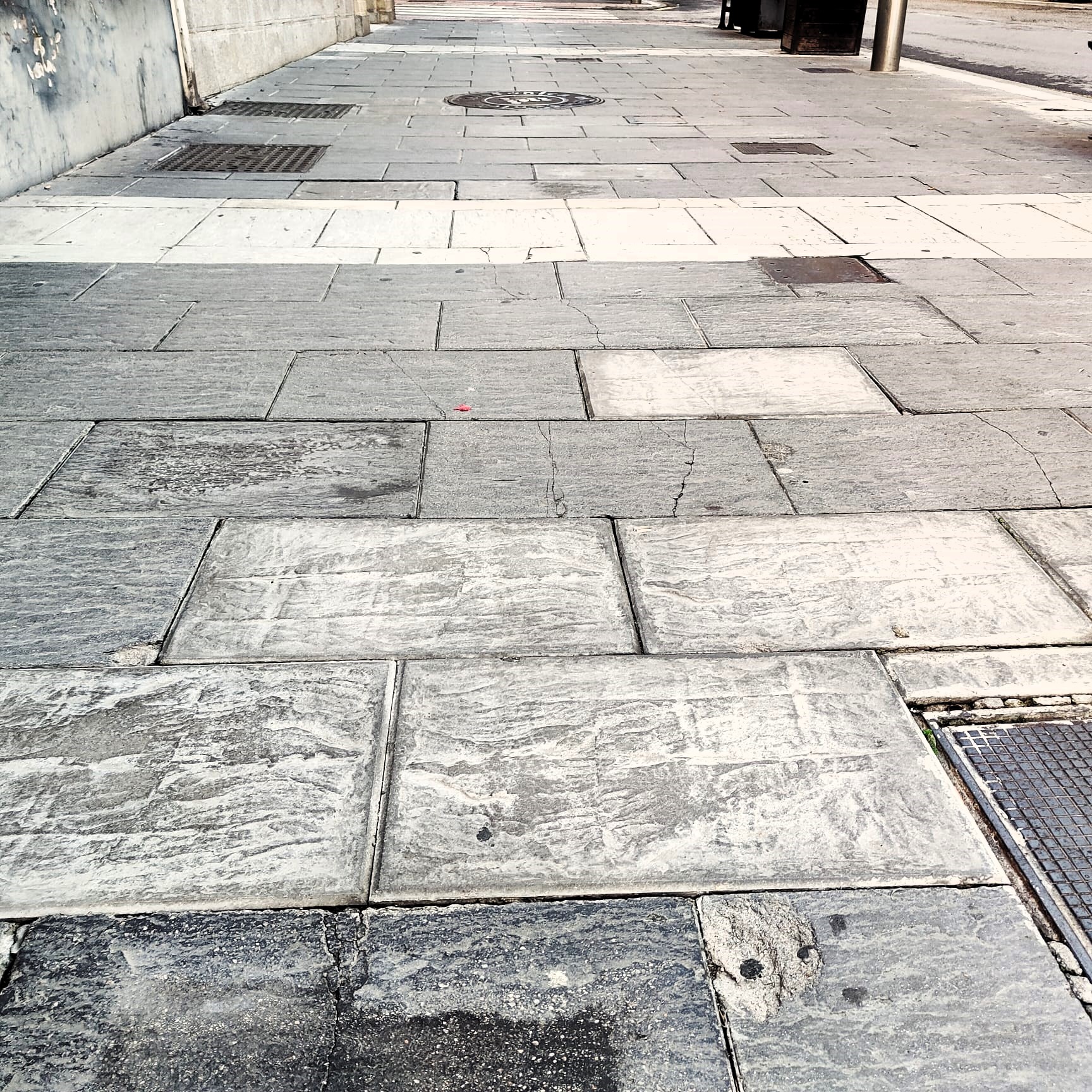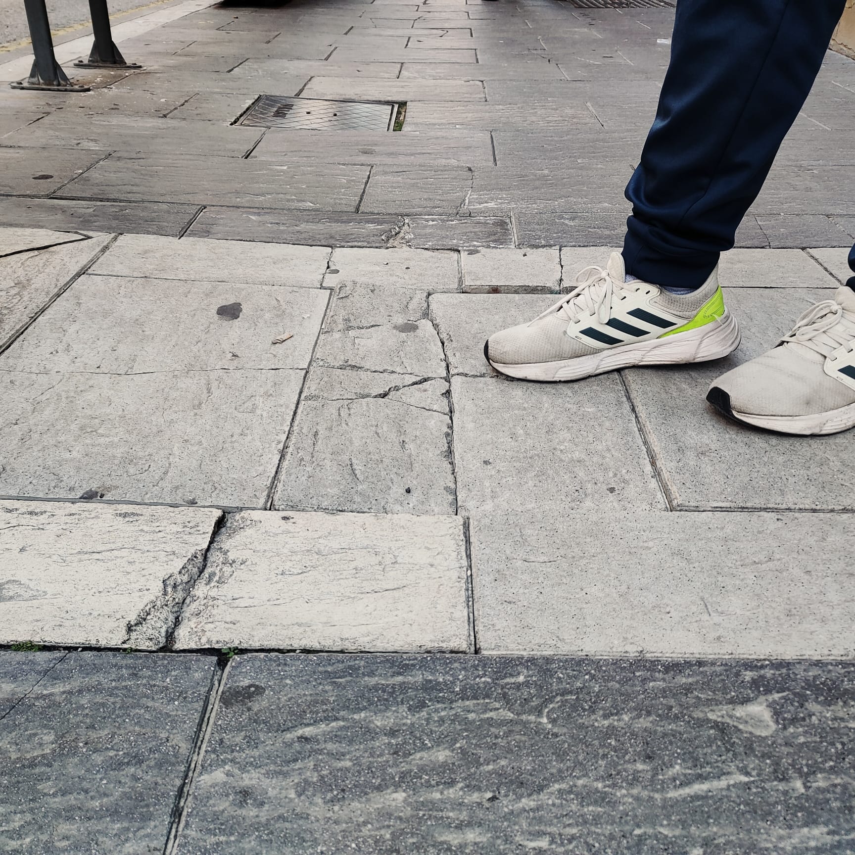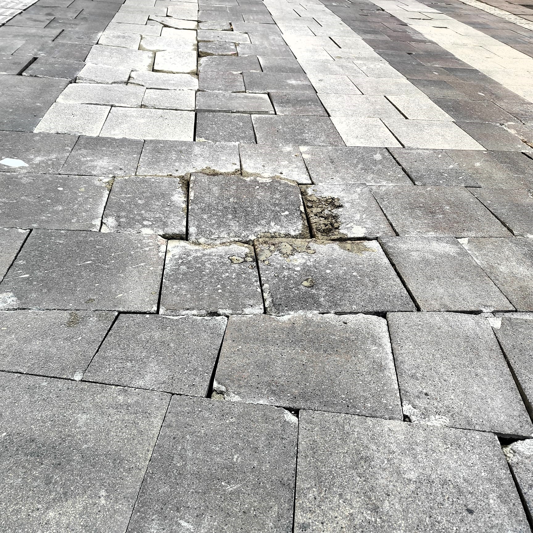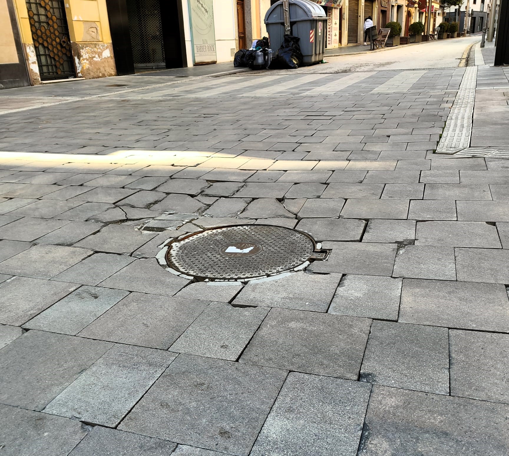 La renovación urbanística de este punto tan importante de la vida de Linares para la creación de la Zona de Bajas Emisiones (ZBE) lejos de solucionar la situación, la ha empeorado. El número de losetas y de adoquines sueltos es incalculable. La mayoría están partidas a la mitad o en varios trozos y el resto están agrietadas o levantadas, lo que hace que los tropezones de los viandantes sean frecuentes, con el peligro que esto supone.