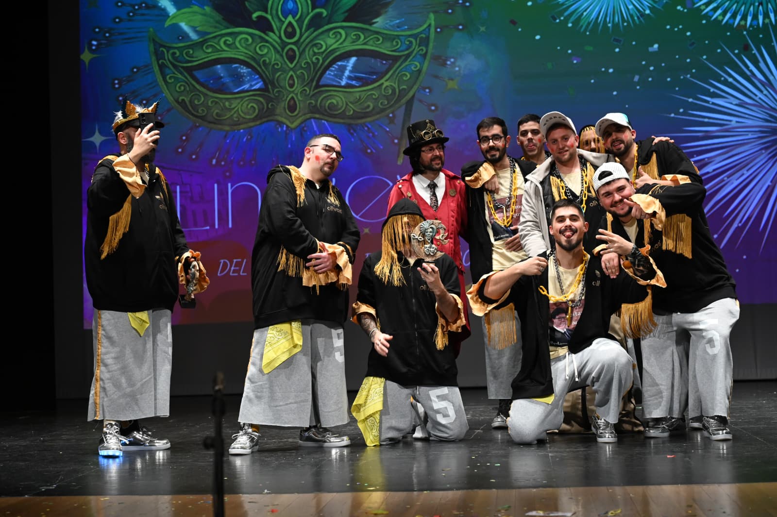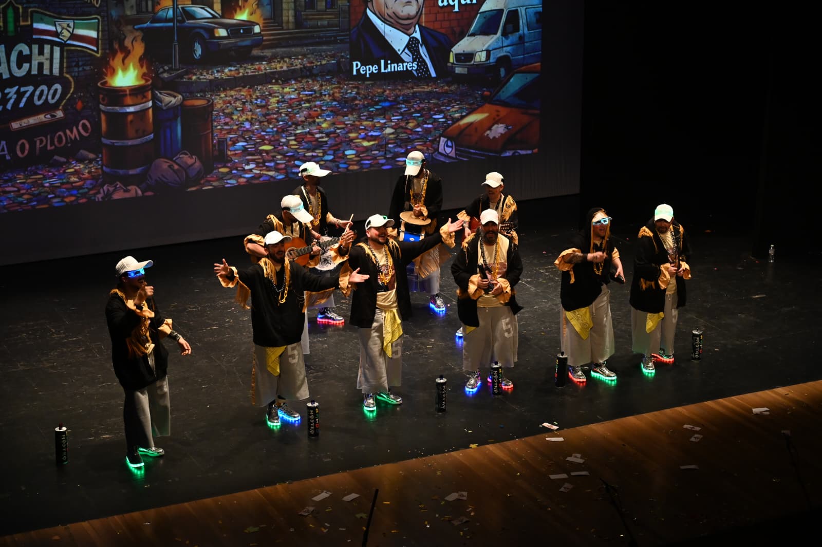 No se quedó atrás la formación local ‘La Banda del Capitán Minero’, que con su ‘Gachi City 23700 Plata o Plomo‘ logró un merecidísimo segundo puesto. Su actuación destacó por una estética urbana muy particular, combinando chándales con detalles dorados, pañuelos y una energía desbordante sobre las tablas que conectó de inmediato con el espíritu más canalla de la fiesta.