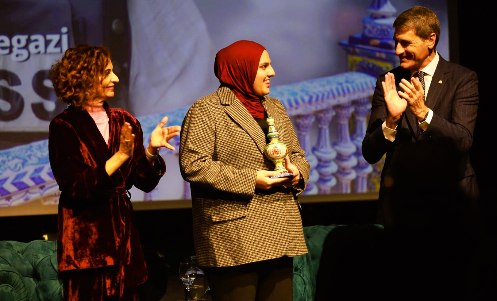 Nur Emad Hegazi recibe el Premio Plaza de España 2025 en nombre de su hermana y en presencia de María Jesús Montero y Pedro Fernández.