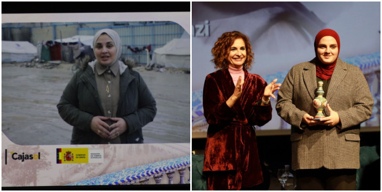 A la izquierda Huda Emad Hegazi, en un vídeo grabado desde Gaza. Sobre estas líneas, su hermana Nur recibe el galardón de manos de la vicepresidenta primera del Gobierno de España.