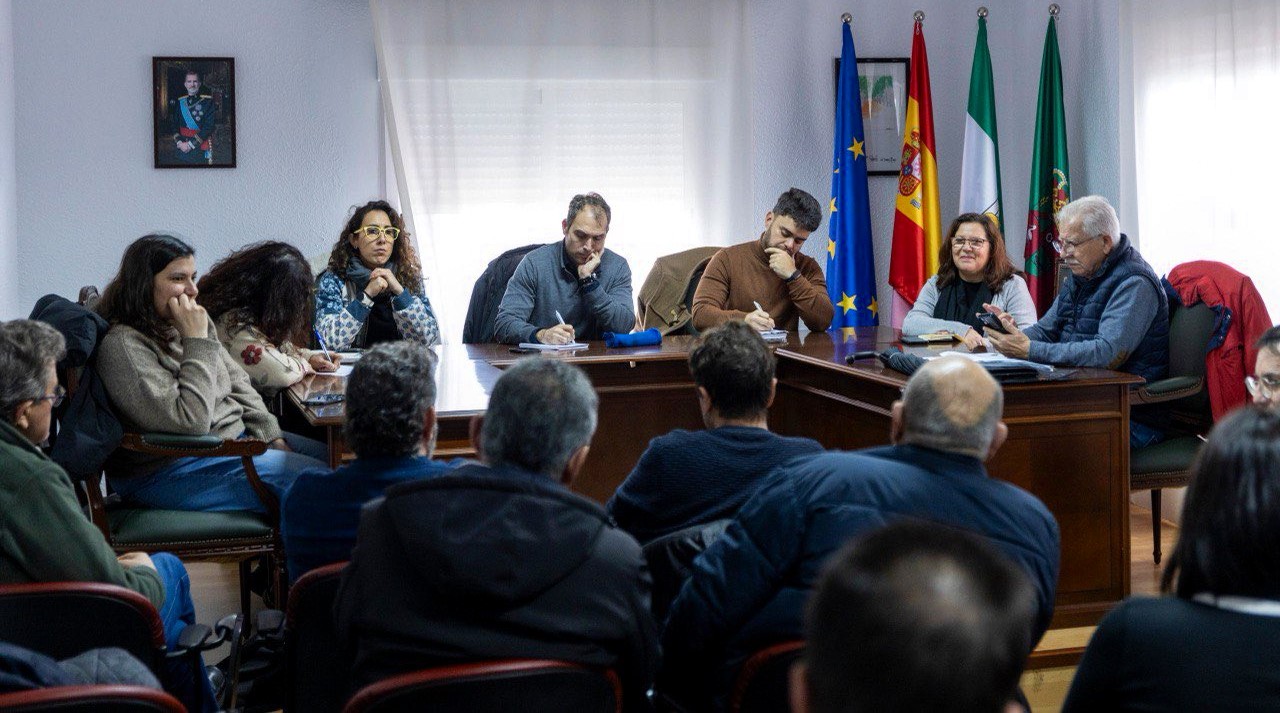 Toni Valero toma nota, flanqueado por Laura Cerezuela y Miguel Manuel García, en la reunión celebrada en el salón de plenos del Ayuntamiento de la Estación Linares-Baeza. Foto: IU Andalucía
