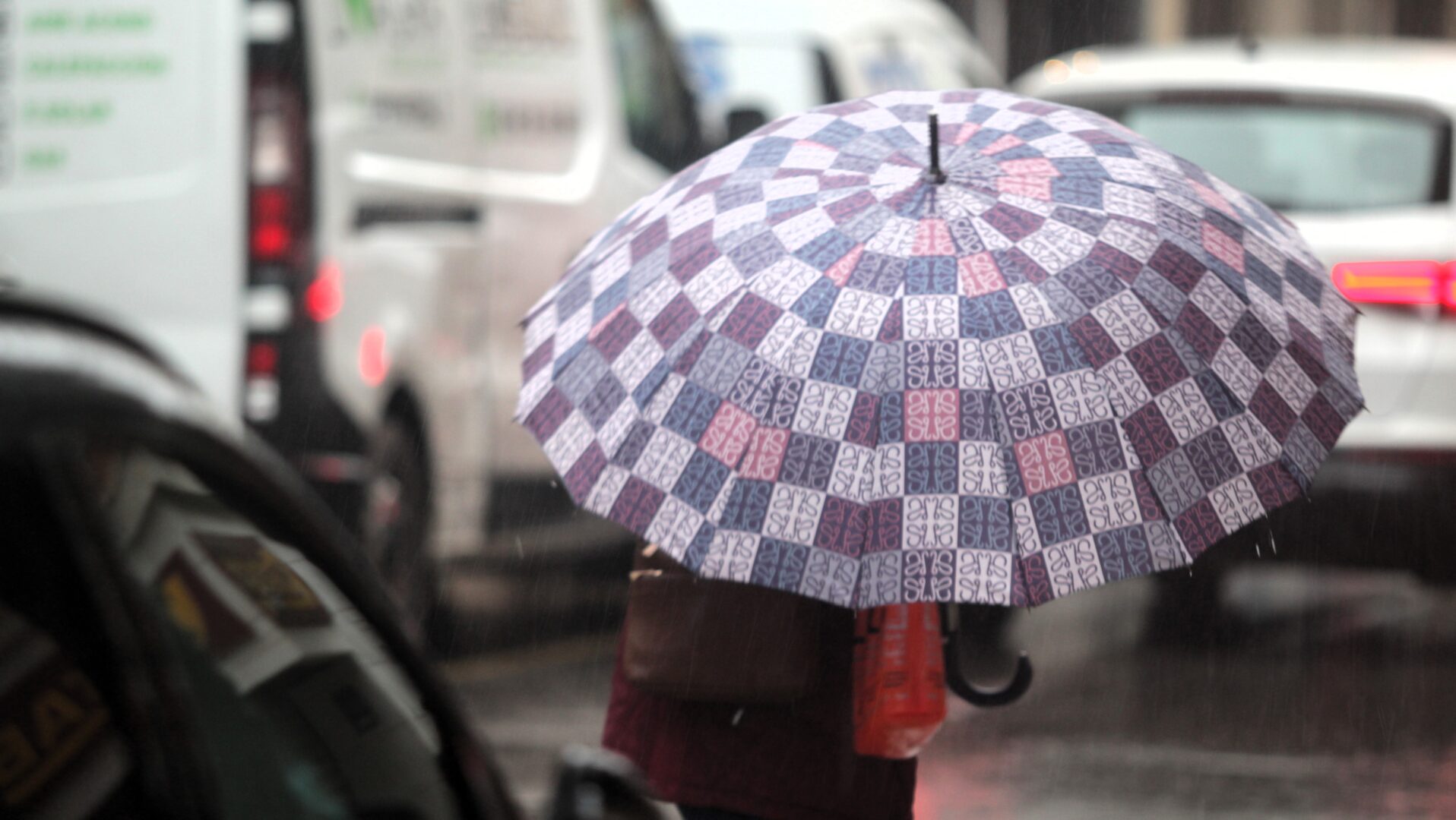 Una mujer se protege de la lluvia y el viento en una calle de Linares. Foto: Javier Esturillo