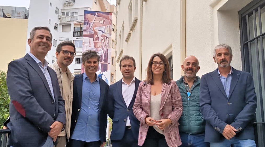 El alcalde de Jaén, Julio Millán, ha visitado este mural junto al hijo del artista homenajeado, Luis Baños, el autor José Ríos y representantes del colegio de las Carmelitas y de Civitas Lucis, además de la diputada de Cultura, África Colomo.