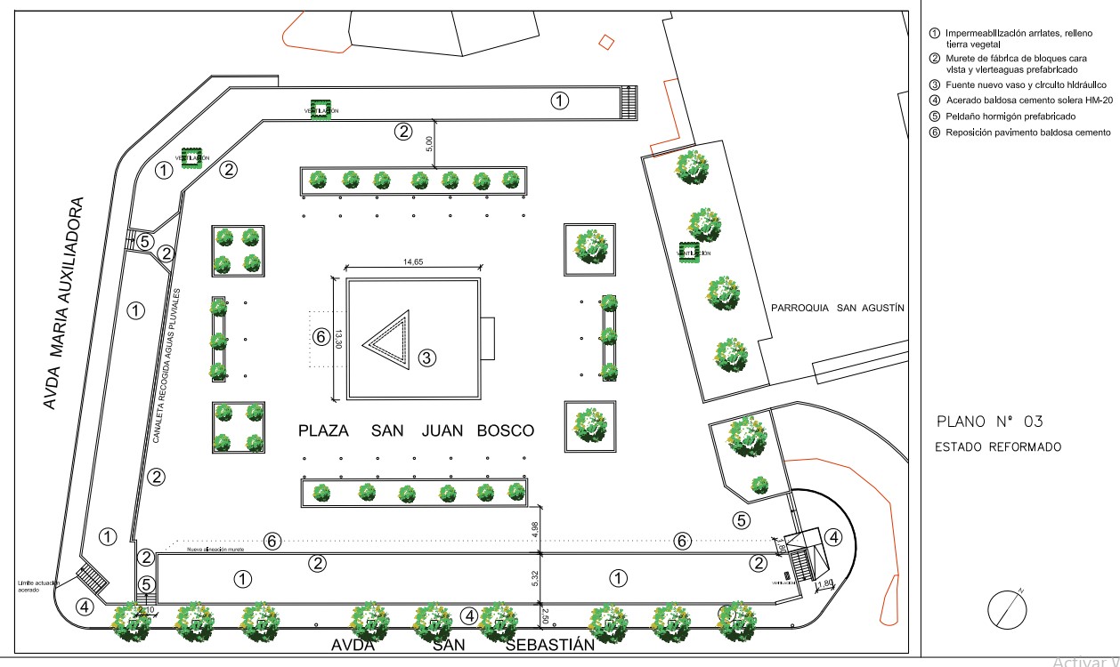 Para ello, se plantea una intervención integral que comenzará con la demolición de elementos dañados, como muretes, albardillas y la propia fuente, que será reconstruida completamente —salvo el cuarto de máquinas— en un único vaso central dotado de un sistema moderno de impermeabilización y una nueva instalación hidráulica.