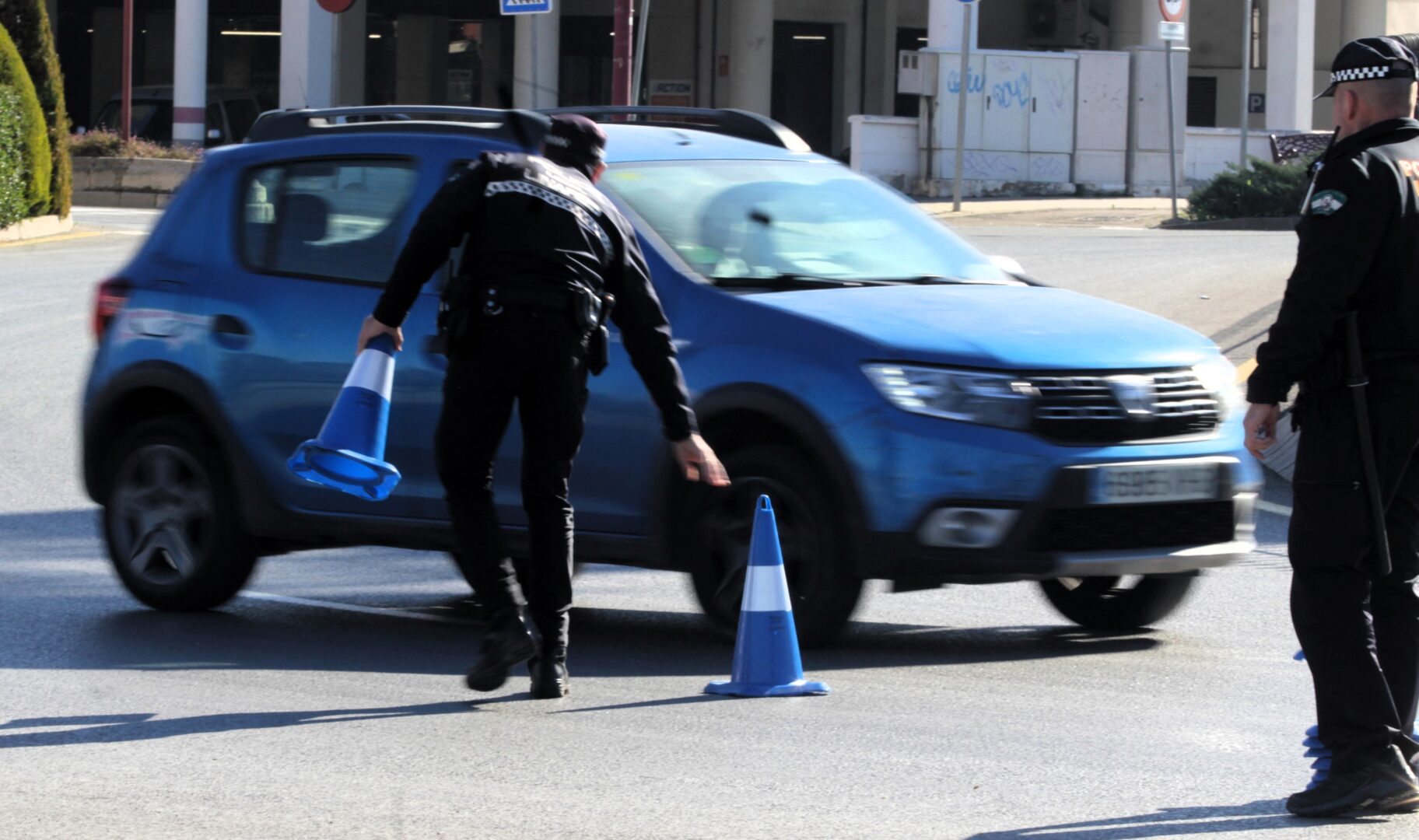 Un agente coloca un cono en un control de la Policía Local en una de las rotondas de entrada y salida del Polígono Los Jarales. Foto: Javier Esturillo