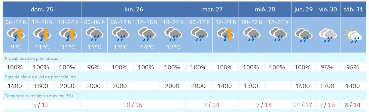 La jornada de este domingo ya advierte de lo que está por venir: cielos cubiertos y tormentas eléctricas que se mantendrán activas durante gran parte del día. Las temperaturas oscilarán entre los 5 grados de mínima y los 12 de máxima, una tendencia que se mantendrá estable durante las primeras 48 horas.