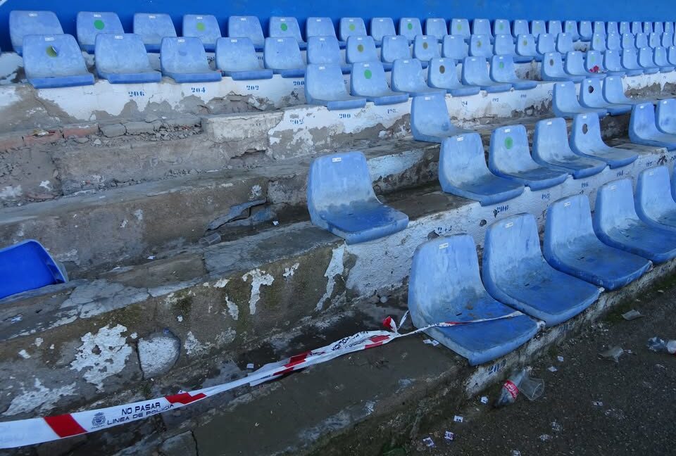 La realidad habla por sí sola: asientos deteriorados, escalones con el hormigón resquebrajado, zonas acordonadas con cinta de seguridad y una evidente falta de conservación.
