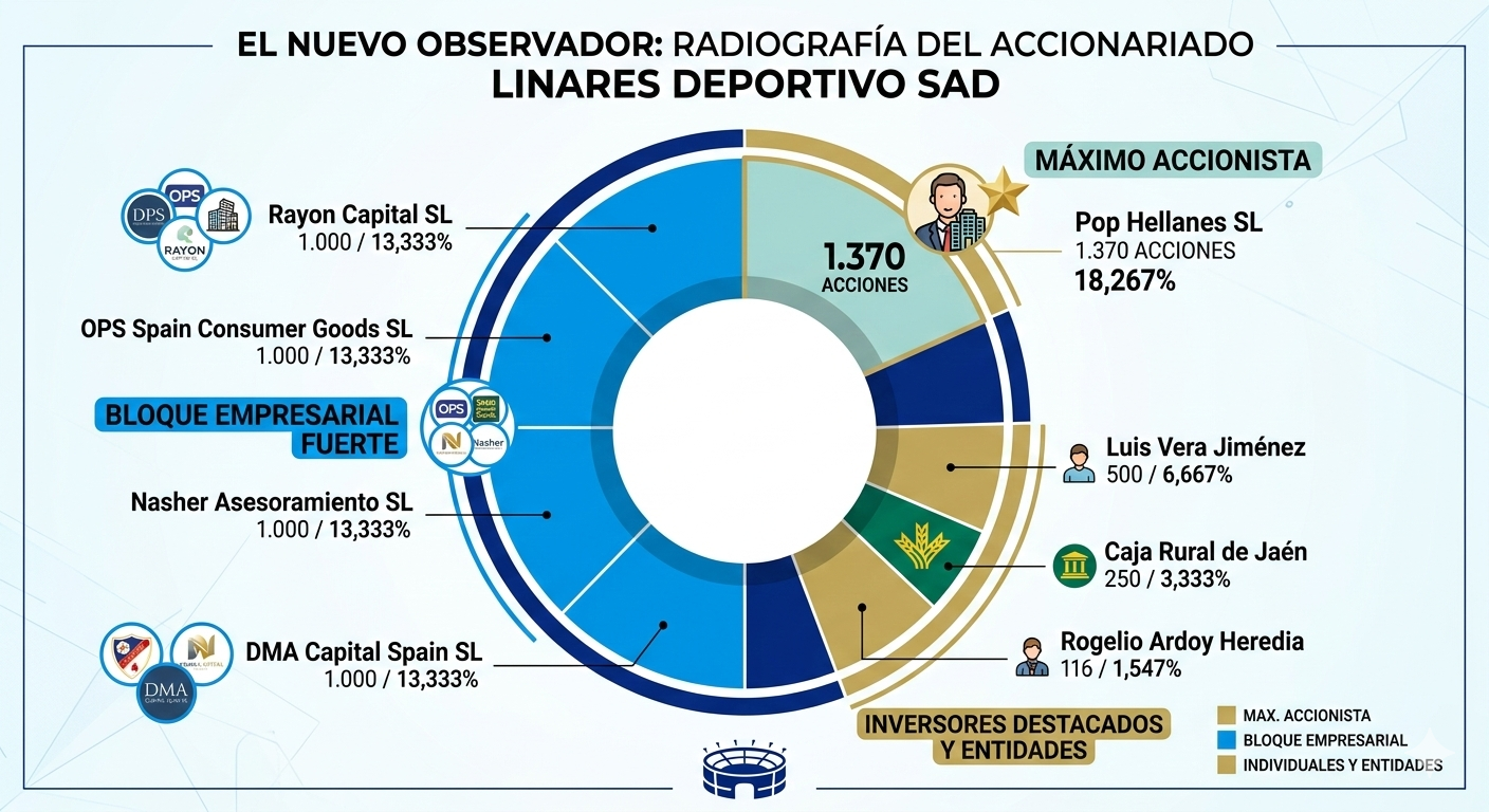 El accionariado del Linares Deportivo SAD dibuja una estructura claramente concentrada en torno a varios bloques empresariales, con un socio que destaca por encima del resto y un grupo de sociedades que, juntas, superan la mayoría del capital.
