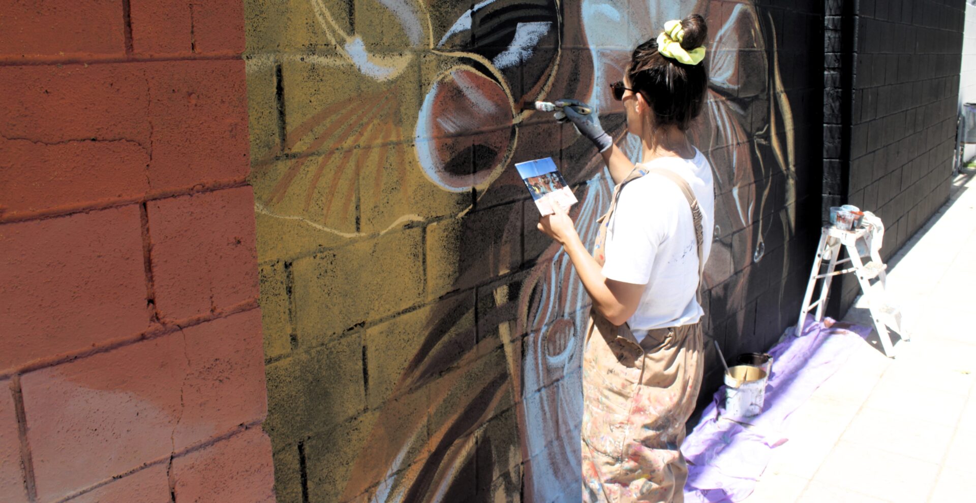Ana Corazón durante el proceso de creación del mural de Baños de la Encina. Foto: Javier Esturillo