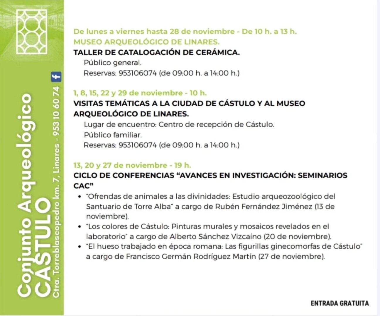 El mes de noviembre es un buen momento para viajar al pasado a través de talleres, visitas guiadas, conferencias y exposiciones. Así, la programación, organizada por la Consejería de Cultura y Deporte de la Junta de Andalucía, invita al público a participar, por ejemplo, en las visitas guiadas que se celebran todos los sábados, a las 10:00 horas, en las que se podrá conocer más de cerca, por ejemplo, el famoso Mosaico de los Amores. El punto de encuentro es el Centro de Recepción de Cástulo, y la participación es gratuita previa reserva.