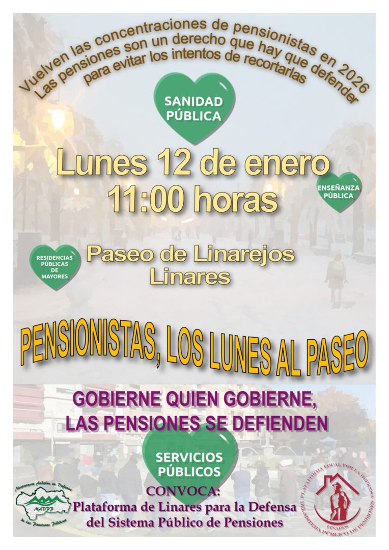 La Plataforma en Defensa del Sistema Público de Pensiones de Linares retoma sus concentraciones el lunes 12 de enero a las 11:00 horas en el Paseo de Linarejos. La movilización coincide con la entrada en vigor del real decreto ley de revalorización de las pensiones para 2026.