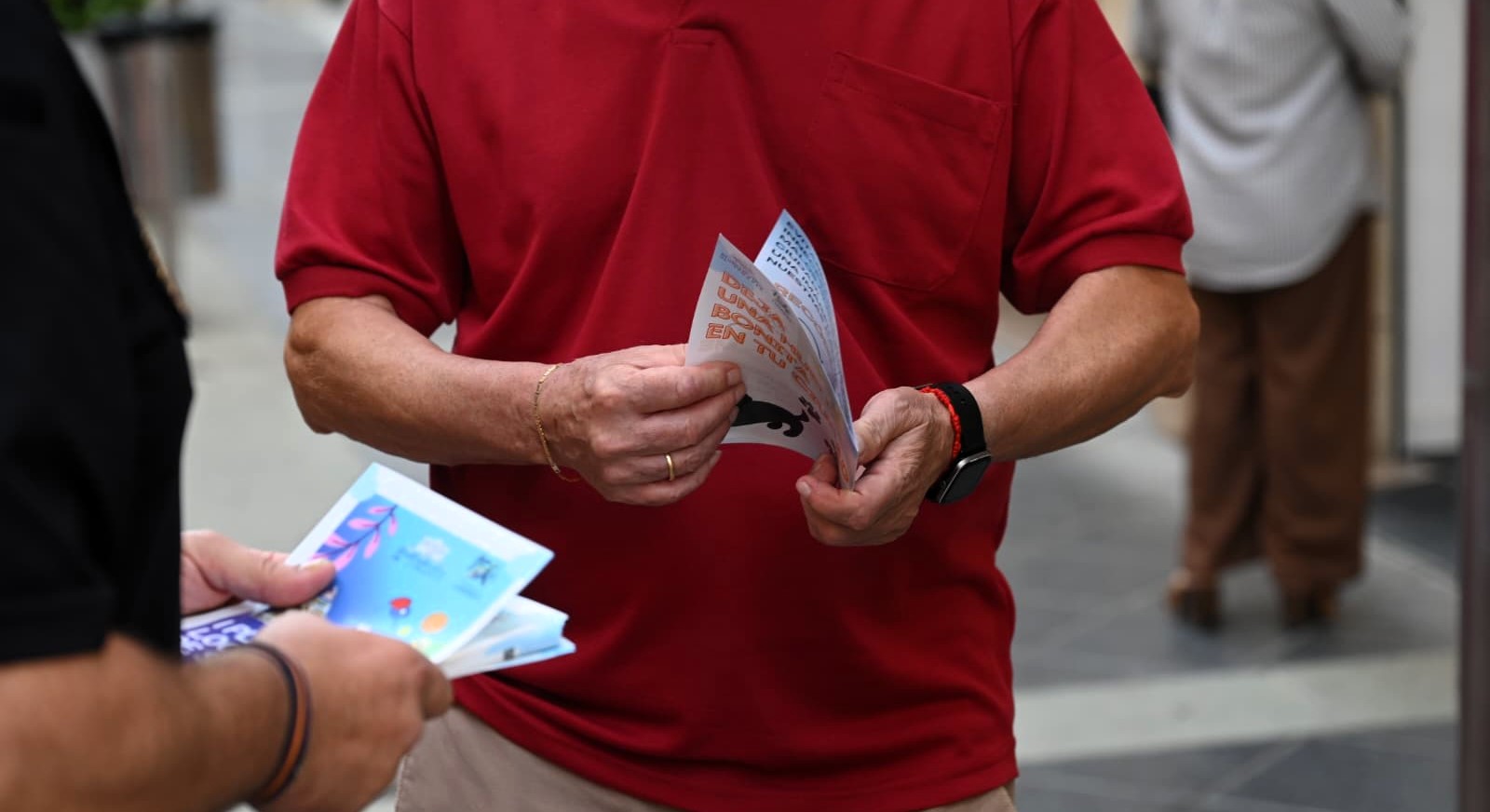 Un hombre hojea uno de los folletos repartidos en el Pasaje del Comercio. Foto: Ayuntamiento de Linares
