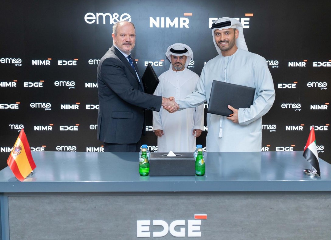 Fernando Fernández estrecha la mano de Khaled Al Zaabi, presidente de Plataformas y Sistemas de Edge. Foto: Escribano Mechanical & Engineering